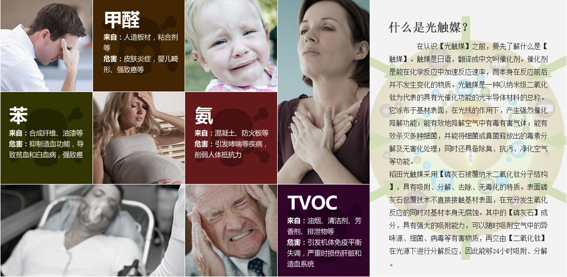 在認識【光觸媒】之前,要先了解什么是【觸媒】。觸媒是日語,翻譯成中文叫催化劑。催化劑是能在化學反應中加速反應速率,而本身在反應前后并不發(fā)生變化的物質(zhì)。光觸媒是一種以納米級二氧化鈦為代表的具有光催化功能的光半導體材料的總稱。它涂布于基材表面,在光線的作用下,產(chǎn)生強烈催化降解功能:能有效地降解空氣中有毒有害氣體;能有效殺滅多種細菌,并能將細菌或真菌釋放出的毒素分解及無害化處理;同時還具備除臭、抗污、凈化空氣等功能。 稻田光觸媒采用【磷灰石被覆納米二氧化鈦分子結構】,具有吸附、分解、去除、無毒化的特質(zhì)。表面磷灰石包覆技術不直接接觸基材表面,在充分發(fā)生氧化反應的同時對基材本身無腐蝕。其中的【磷灰石】成分,具有強大的吸附能力,可以隨時吸附空氣中的異味源、細菌、病毒等有害物質(zhì),再交由【二氧化鈦】在光源下進行分解反應,因此能夠24小時吸附、分解